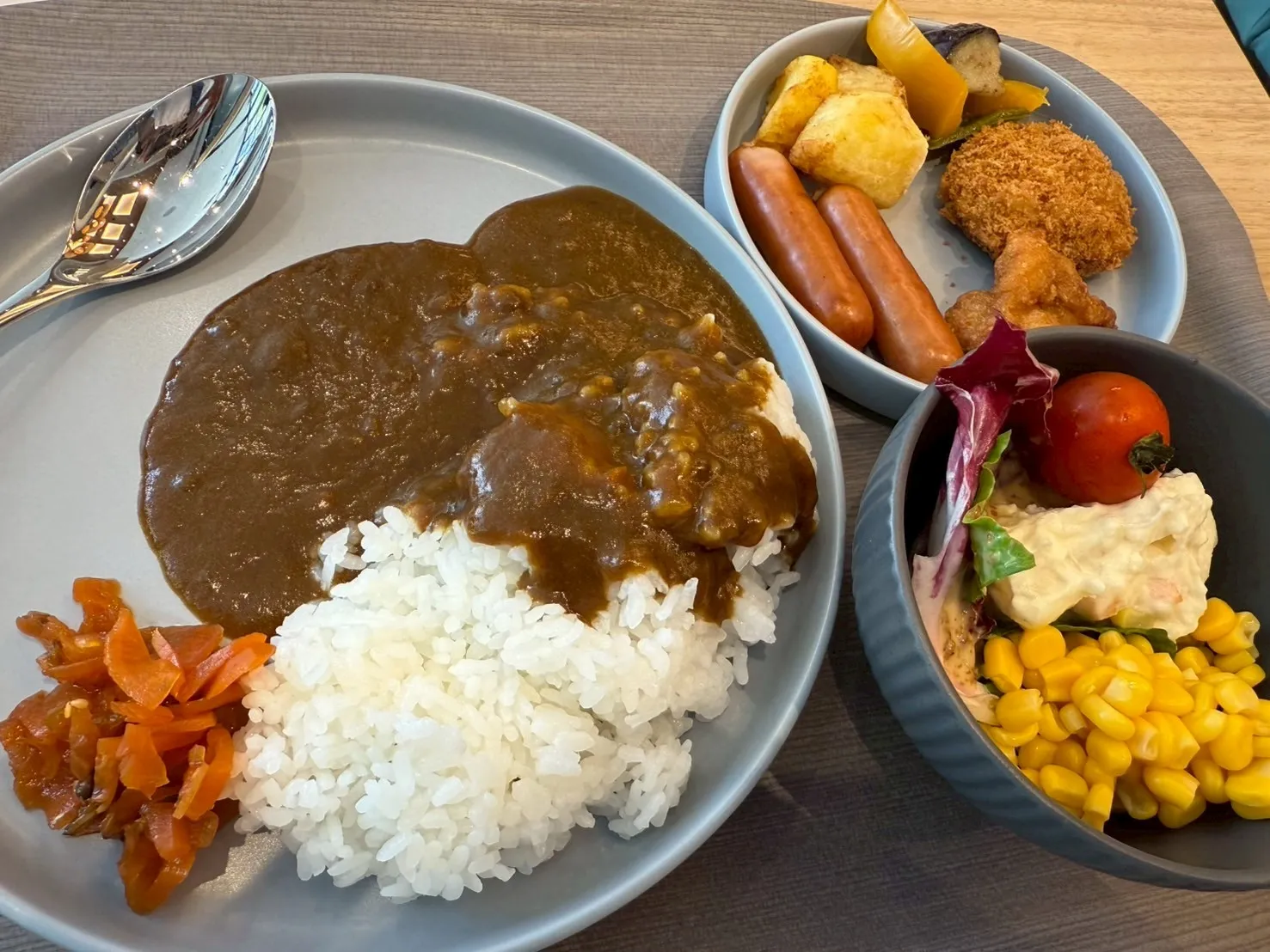 カレーの他にも、ヒレカツやポークソーセージなど、相性抜群のトッピングをバイキング形式で楽しめます★